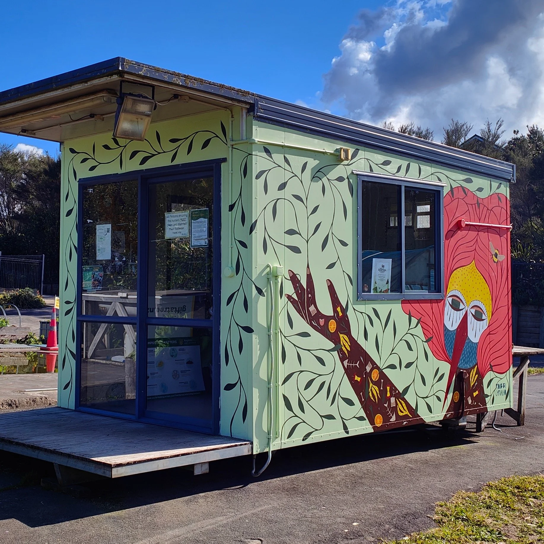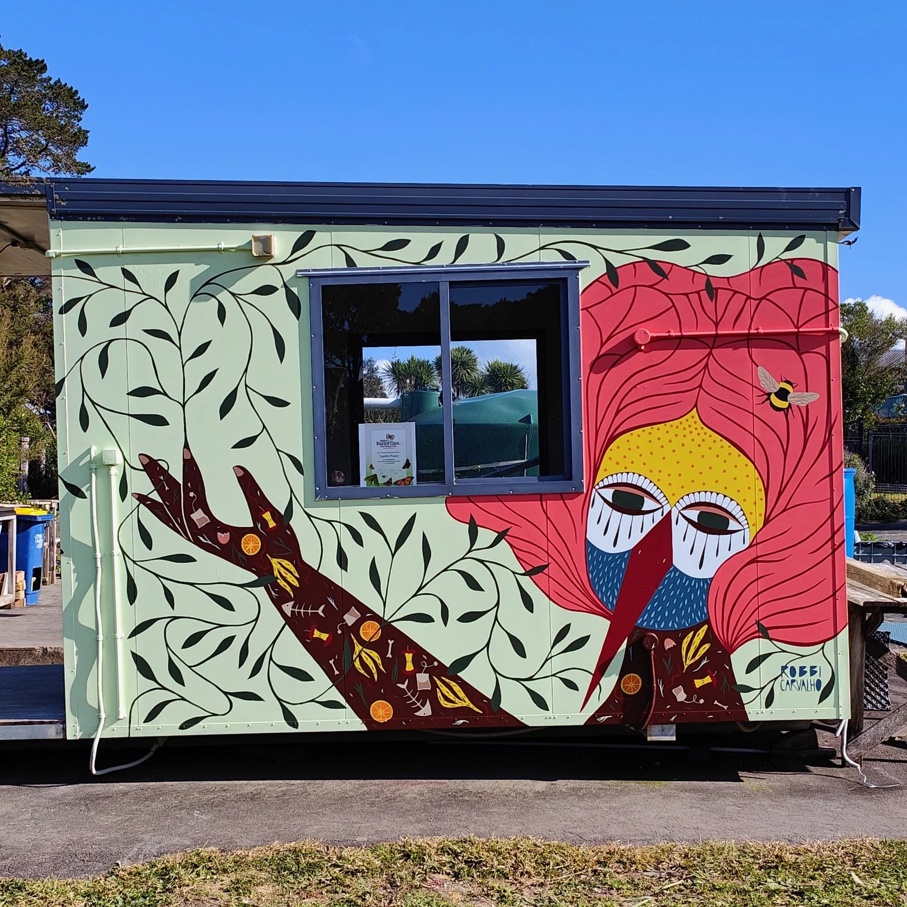Sponsored by the Upper Harbour Local Board and painted on the Kaipātiki Project’s Community Compost Hub in Hobsonville Point, I drew inspiration from the local birds, flowers, and the dedicated volunteers who bring this place to life.