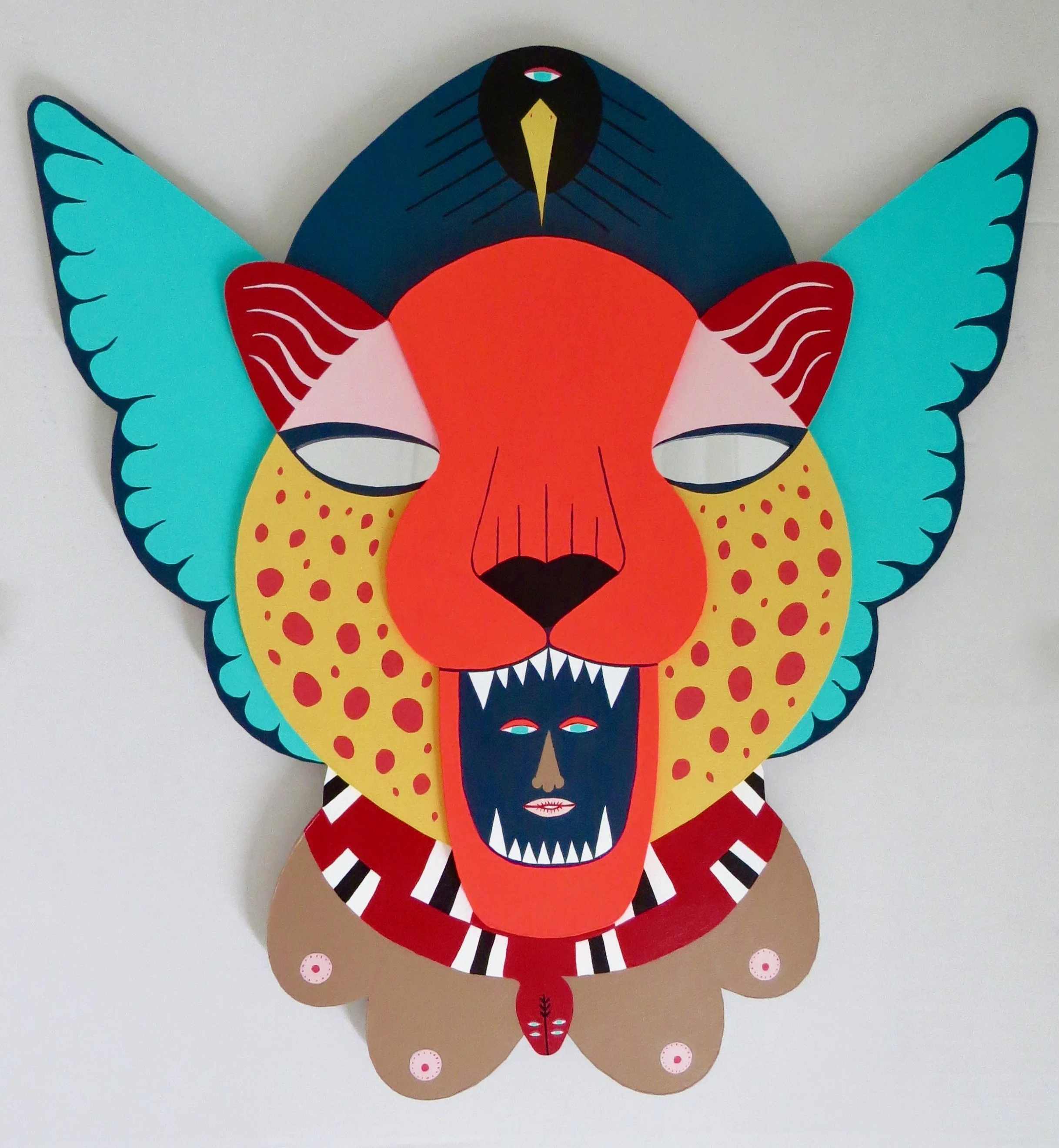 ‘Onça Caetana’ is sometimes a woman, sometimes a jaguar. She comes for people at the moment of death. As a woman, she is sweet, with her hair enveloping them in a comforting embrace. As a jaguar, she is fierce and terrifying, with sharp claws and fangs. This magical character embodies the duality of the human condition within a single body. She is both human and animal, life and death, pure and wicked, lascivious and dangerous, peaceful and treacherous. She is the woman who gives life but also takes it away, in the ritual of passage to the afterlife. This mask, with mirrored eyes, invites the observer to question their own duality. They see themselves reflected in the jaguar's gaze, as prey. Yet, when masked, they can transform into the predator.